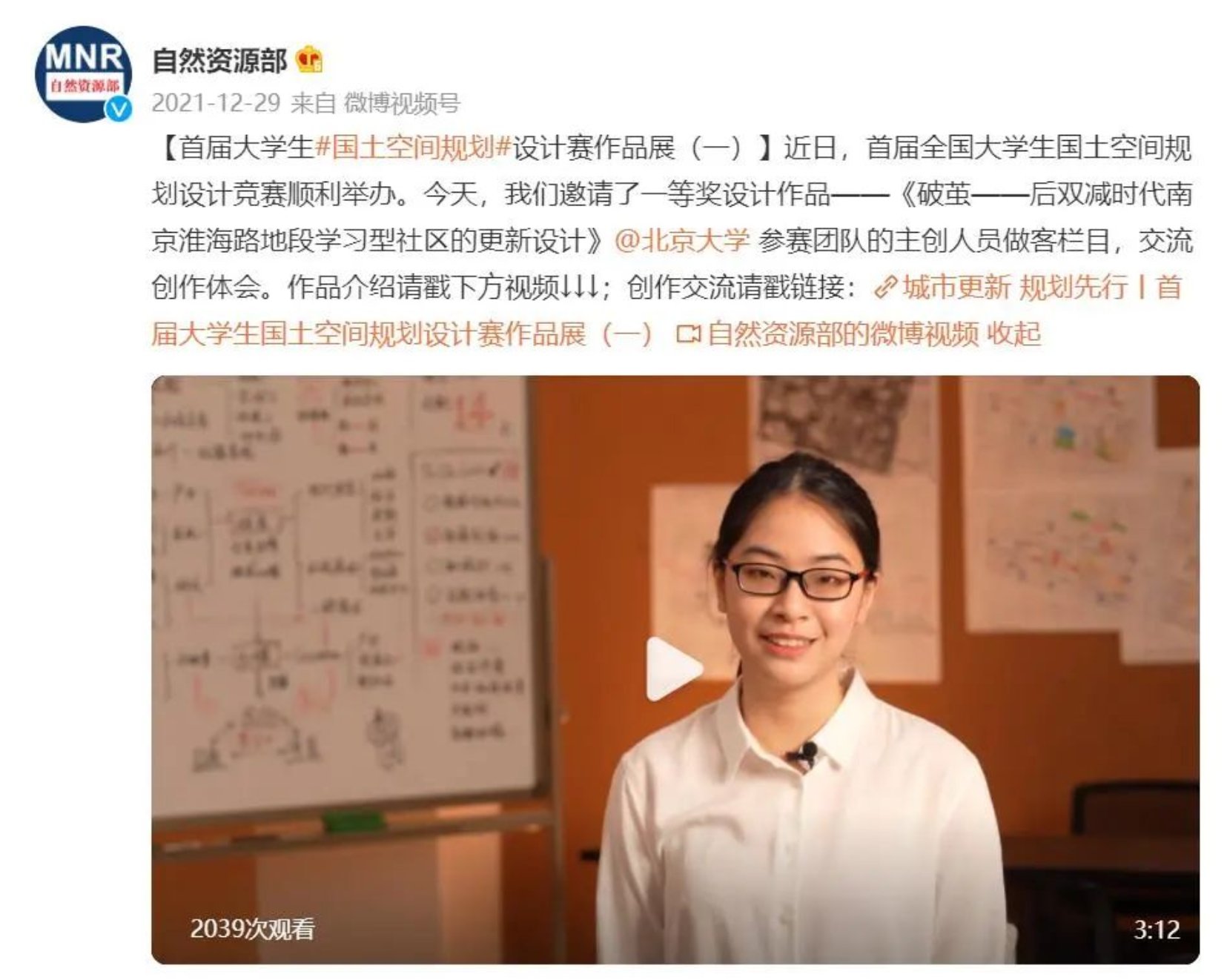 此外,作为组长,她于2021年暑假参加了自然资源部主办的首届全国大学生国土空间规划设计竞赛,在学院四位老师的指导下,带领团队完成了较为满意的成果,《破茧——后双减时代南京淮海路地段学习型社区的更新设计》获得了全国唯二的一等奖。设计作品和创作历程获得了自然资源部相关部门采访,在自然资源部官方微博、微信平台及中国自然资源报上发表。