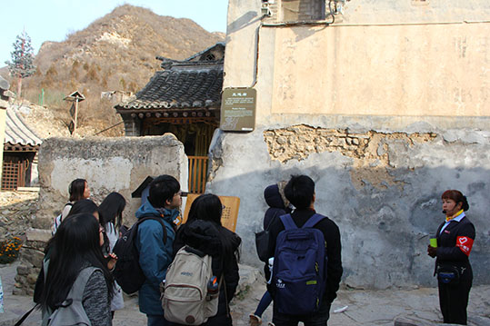 正式开始调研考察,讲解员带领同学们一边参观,一边详细介绍爨底下村的历史文化背景。爨底下村的形成始于明朝加强边境防守的需要,位于一道军事隘口——爨里口之下,是我国首次发现的保留比较完整的山村古建筑群,拥有巨大的遗产价值。整个村落建于缓坡之上,层层升高,依山而建,以村后龙头为圆心,南北为轴线呈扇面形展于两侧,使全村形不散而神更聚,三条通道惯穿上下,而更具防洪、防匪之功能,充分体现人、建筑与环境的完美结合。
