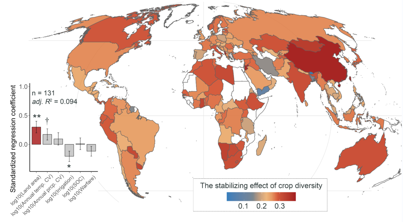 该研究结果以“Larger nations benefit more than smaller nations from the stabilizing effects of crop diversity”为题,2024年5月24日发表在《自然·食物》(Nature Food)期刊。z6尊龙凯时ag旗舰厅在站博士后孟博为论文第一作者,王少鹏研究员为论文通讯作者,合作者包括博士研究生杨其和科罗拉多大学助理教授Zia Mehrabi。本研究得到了国家自然科学基金、国家重点研发计划、博士后科学基金等资助。