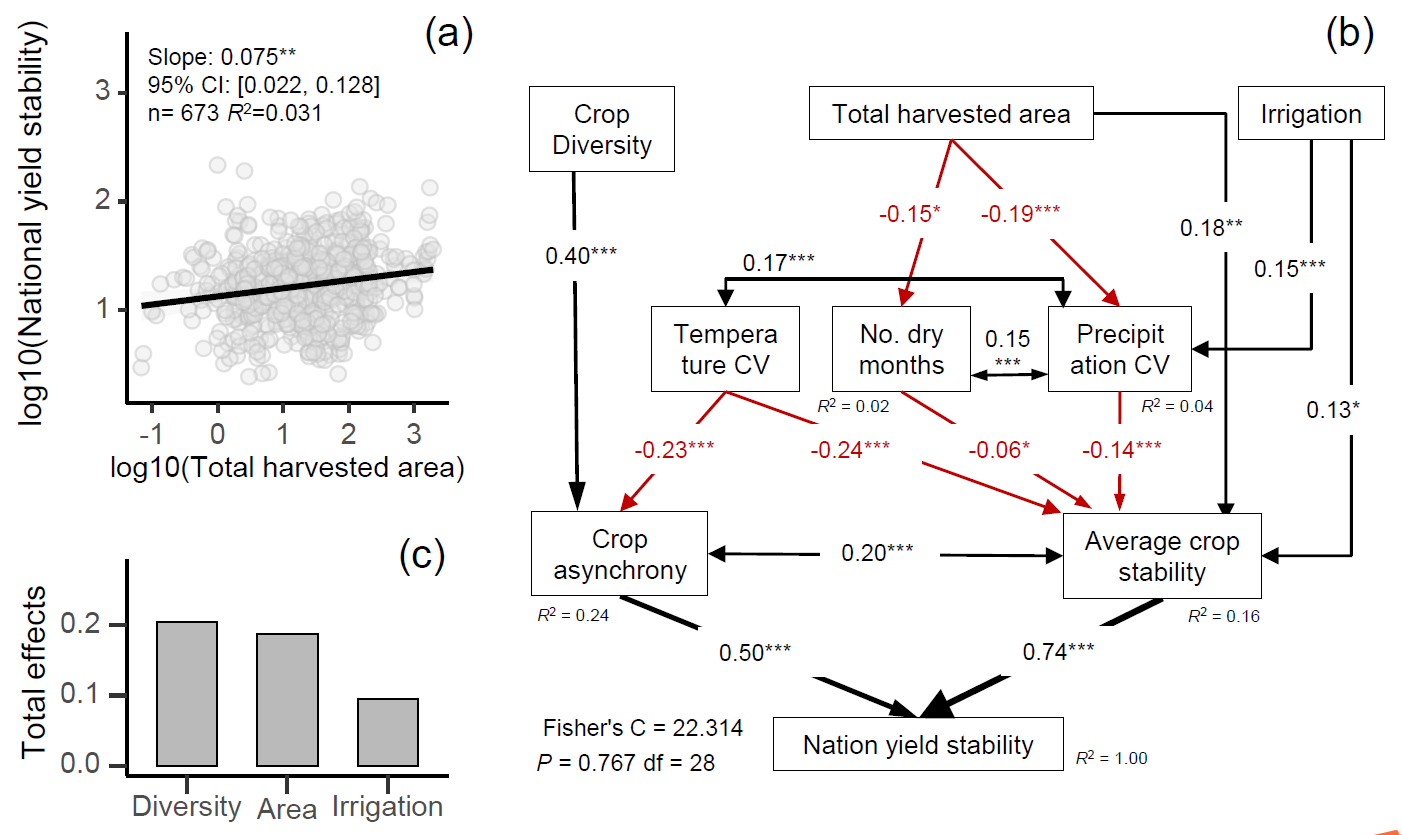 图1.作物多样性与收获面积对国家粮食产量稳定性的影响